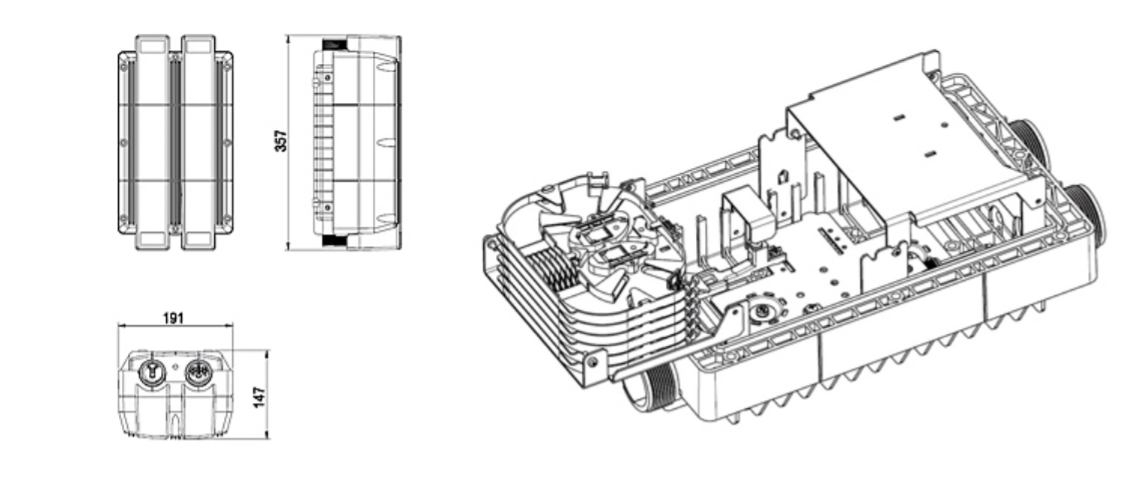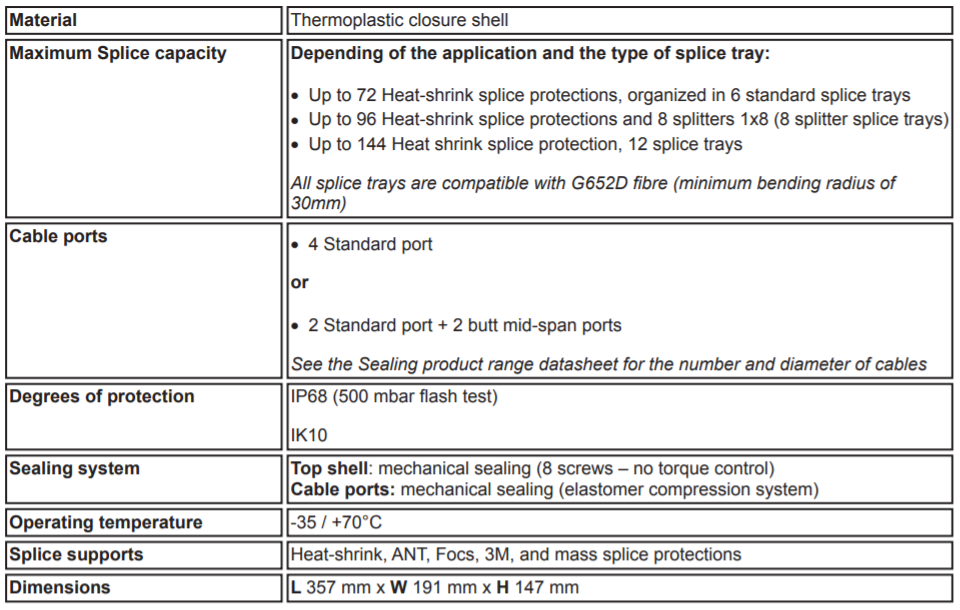- Cable sealing devices based on a mechanical compression system: this allows re-using all components for future upgrades or re-accessing to the closure. (No tape, glue, heat-shrink tubes, or cable jacket preparation is needed).