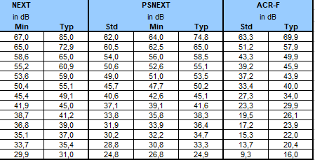 | Alle verdier er basert på Worst Case 4 Konnector Kanal konfigurasjon etter ISO11801. Minimum og maksimum verdier representerer garantert Kanalytelse. Standard verdier basert på ISO11801 Klasse EA |